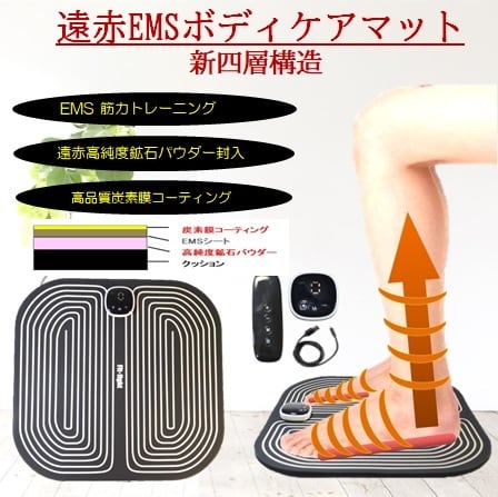 EMS筋力トレーニングが楽しめるボディケアマットは表面に「炭素膜コーティング」や中面に「遠赤鉱石コーティング」された新四層構造マットです。リモコン付で6モードと19段階強度調節が付いた充電式タイプです。 立仕事で疲れた脚・太ももや腕に充て筋力トレーニングが楽しめます。