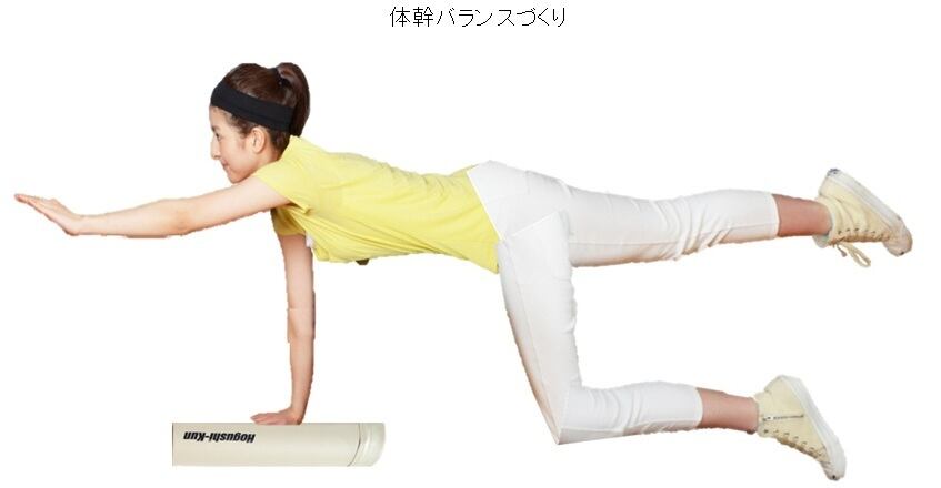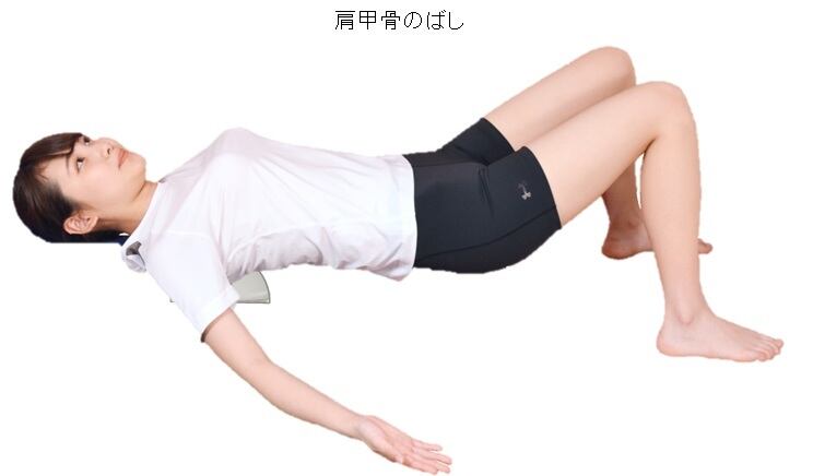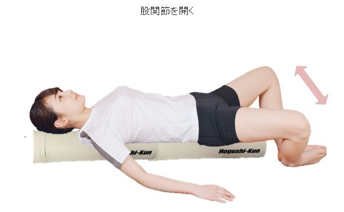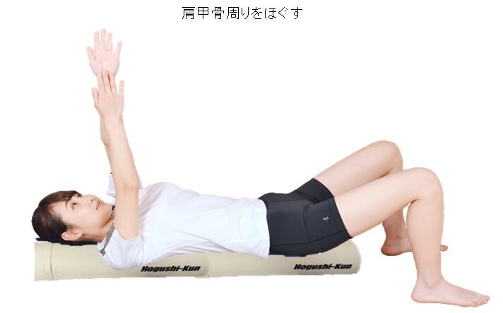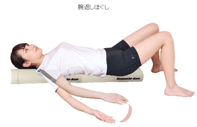 Hogushi-kunに体を預けてリラックスし、深呼吸をすることで、自然と肩が落ちます。すると胸が開いて深呼吸がしやすくなり、肋骨周りの細かい筋肉も伸びるストレッチができ、背骨や骨盤が正しい位置に戻り、歪んで床に付かなかった肩が沈み背中のハリが和らぎます。Hogushi-kun本体は硬度約40度設定で固くなく年配者や女性ににも手軽に使えます。