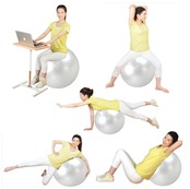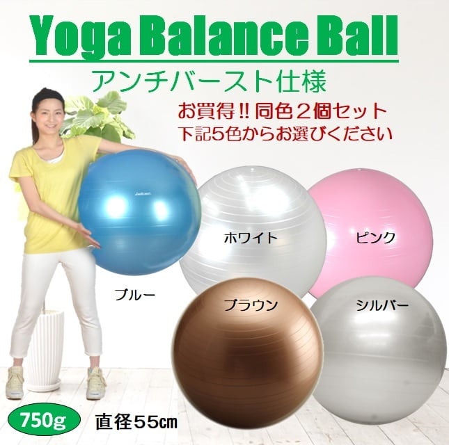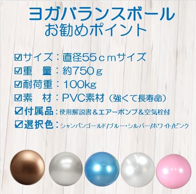 ヨガエクサボールの使用サイズ直径55㎝サイズで使用者身長は150~170㎝と言われています。 製品素材は耐荷重に強いPVCを使用し側厚の約750gを採用しており,もしもの破損にもゆっくりと空気が抜けてゆく準アンチバースト仕様となっております。また付属の空気ポンプは丈夫なハンド式で押し引き時にも空気を入れることが出来るダブル方式を採用しフットポンプの約半分の時間で膨らますことが出来ます。さらに付属の空気栓は予備を含め2個入りで空気をと抜くサポートの栓抜きもセットしております。ボールカラーはシャンパンゴールド・ピンク・ブルー・シルバー・ホワイトの5色を揃えておりお好みのカラーをお選びいただけます。