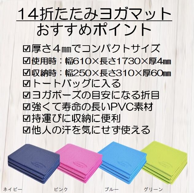 折りたたみヨガマットは床に置くことでしっかりとボディストレッチが楽しめます。素材は丈夫で寿命が長いPVC素材を使っており4mm厚で弾力もあります。コンパクトで収納性に優れバッグに入れての持ち運びも簡単です。ヨガの「開脚ストレッチ」「合せきのポーズ」「三角のポーズ」「立木のポーズ」「太鼓橋のポーズ」「V字ポーズ」「ワニのポーズ」「コブラのポーズ」のポーズにも対応できます。太りにくい体づくりは柔軟で歪のない筋力づくりが大切で健康寿命を延ばすにも同様で日々のストレッチ運動が欠かせません。フローリングやカーペットの上の置いてしっかりと体の柔軟設計ストレッチができる「折りたたみヨガエクサマット」お勧めします。撥水性素材なので汗や水がかかっても拭き取るだけです。