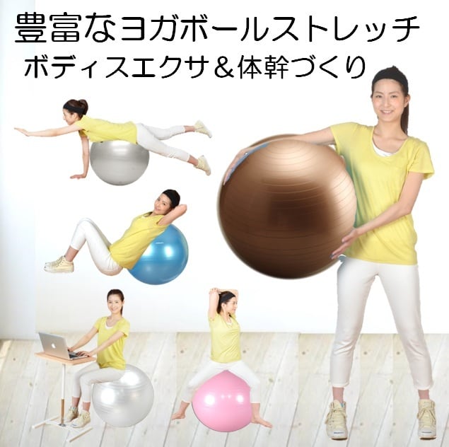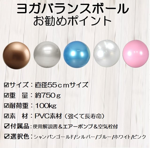 ヨガエクサボールの使用サイズ直径55㎝サイズで使用者身長は150~170㎝と言われています。 製品素材は耐荷重に強いPVCを使用し側厚の約750gを採用しており,もしもの破損にもゆっくりと空気が抜けてゆく準アンチバースト仕様となっております。また付属の空気ポンプは丈夫なハンド式で押し引き時にも空気を入れることが出来るダブル方式を採用しフットポンプの約半分の時間で膨らますことが出来ます。さらに付属の空気栓は予備を含め2個入りで空気をと抜くサポートの栓抜きもセットしております。ボールカラーはシャンパンゴールド・ピンク・ブルー・シルバー・ホワイトの5色を揃えておりお好みのカラーをお選びいただけます。