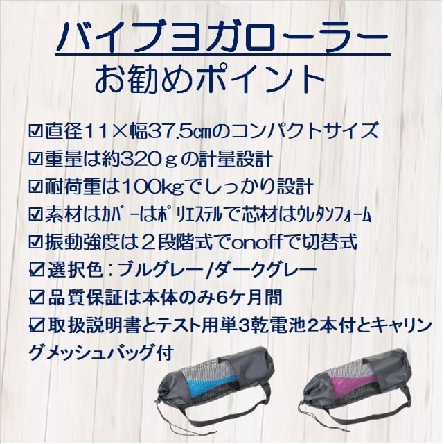 疲れた足腰やボディは骨格を支える筋力が強張って固くなり体の流れリズムが悪くなっています。軽いマッサージでは疲れたボディをいやすことは難しく時間もかかります。そこで体に優しいウレタン素材使用で2段階振動式の「バイブヨガローラー」を当てて疲れを癒すことをお勧めします。太ももに!ふくらはぎに!腰に!首に!あて軽くローリングする事で体の外側から内側へ振動が伝わり、強張り歪んだ筋力をほぐし柔軟な状態にし体の本来のリズムに戻るサポートになり、電池式なので電池を取り換えることですぐに継続して使用することが出来き、充電式でリチューム電池等での「発火」の心配がない製品です。