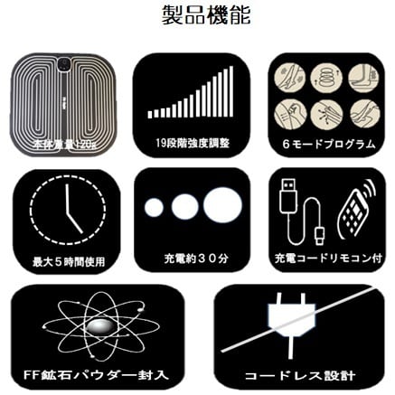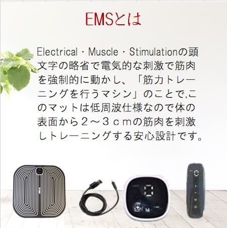 EMS筋力トレーニングが楽しめるボディケアマットは表面に「炭素膜コーティング」や中面に「遠赤鉱石コーティング」された新四層構造マットです。リモコン付で6モードと19段階強度調節が付いた充電式タイプです。 立仕事で疲れた脚・太ももや腕に充て筋力トレーニングが楽しめます。