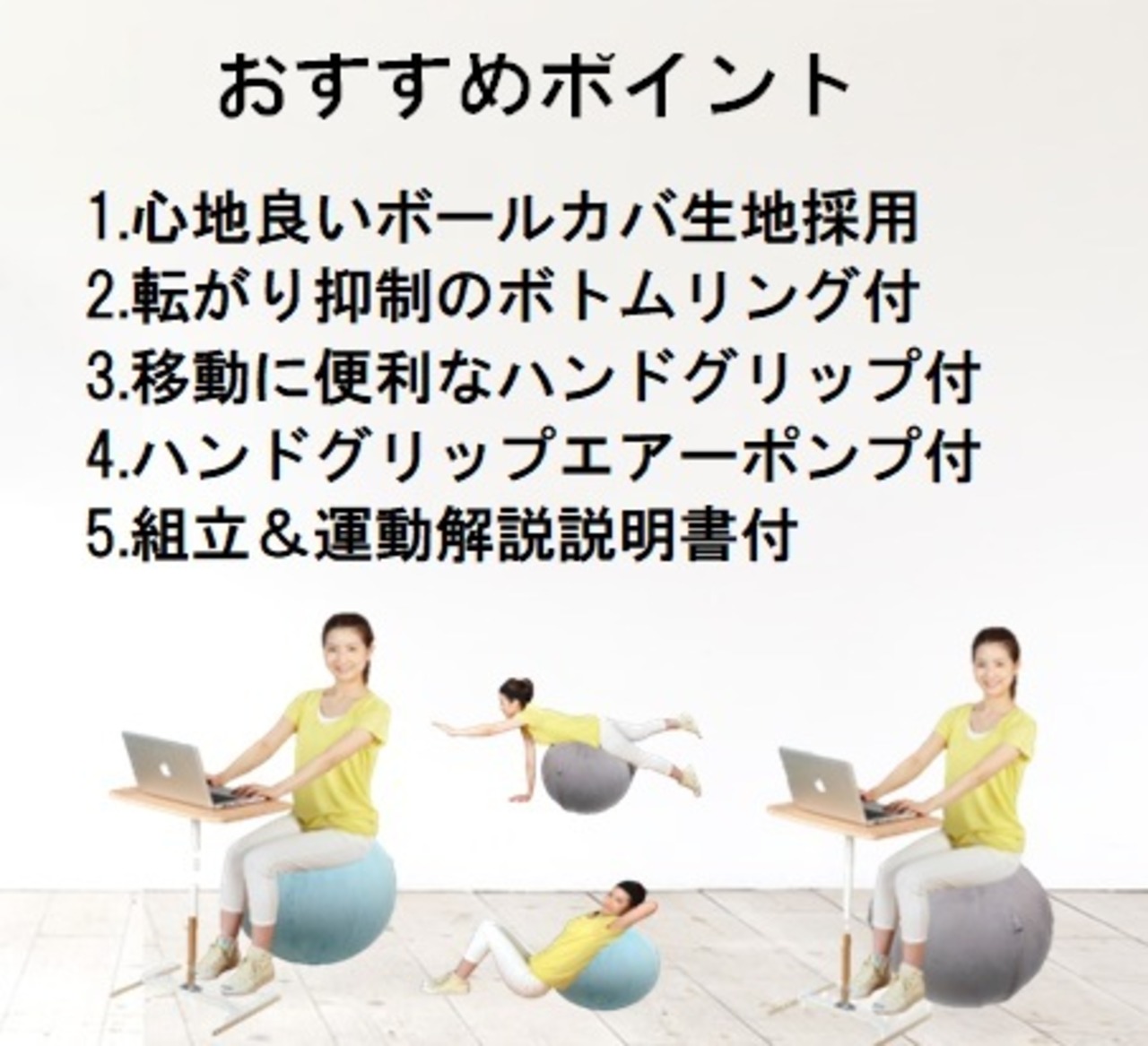 お洒落で心地良いカバー付ヨガバランスボールは直径55cmで身長約150~175cm の方向けヨガボールです。座ったり体を預けて●骨盤起立運動 ●骨盤底筋運動 ●背筋伸ばし運動 ●ウエスト周辺運動 ●側体伸ばし ●背筋伸ばし●腕伸展運動 ●体幹トレーニングの身体運動が楽しめます。カラーはブルー系とグレー系の2色を揃え。ハンドポンプに空気栓・栓抜も付属しています。