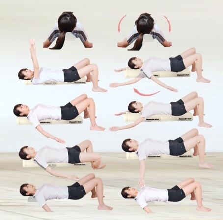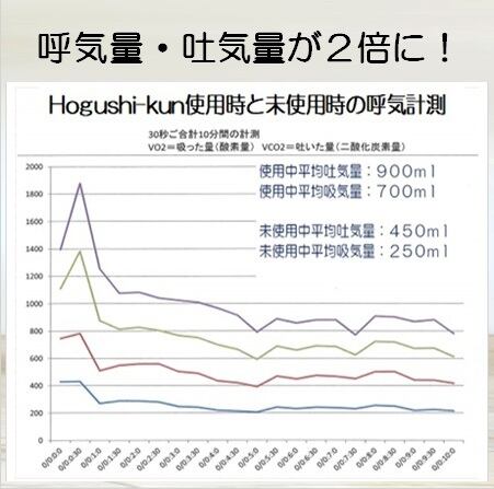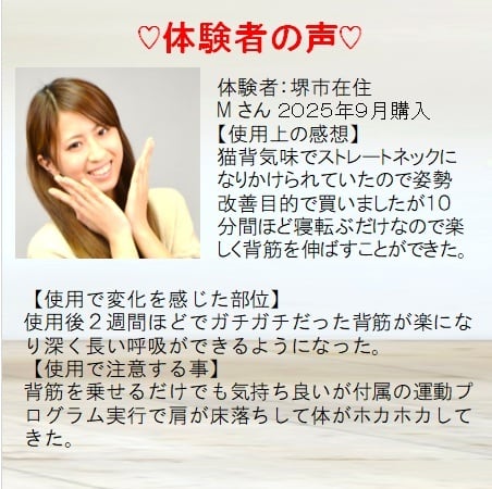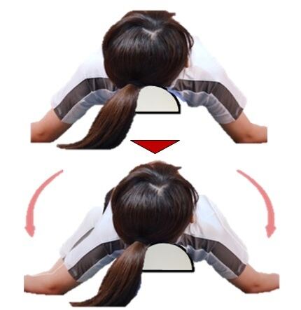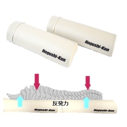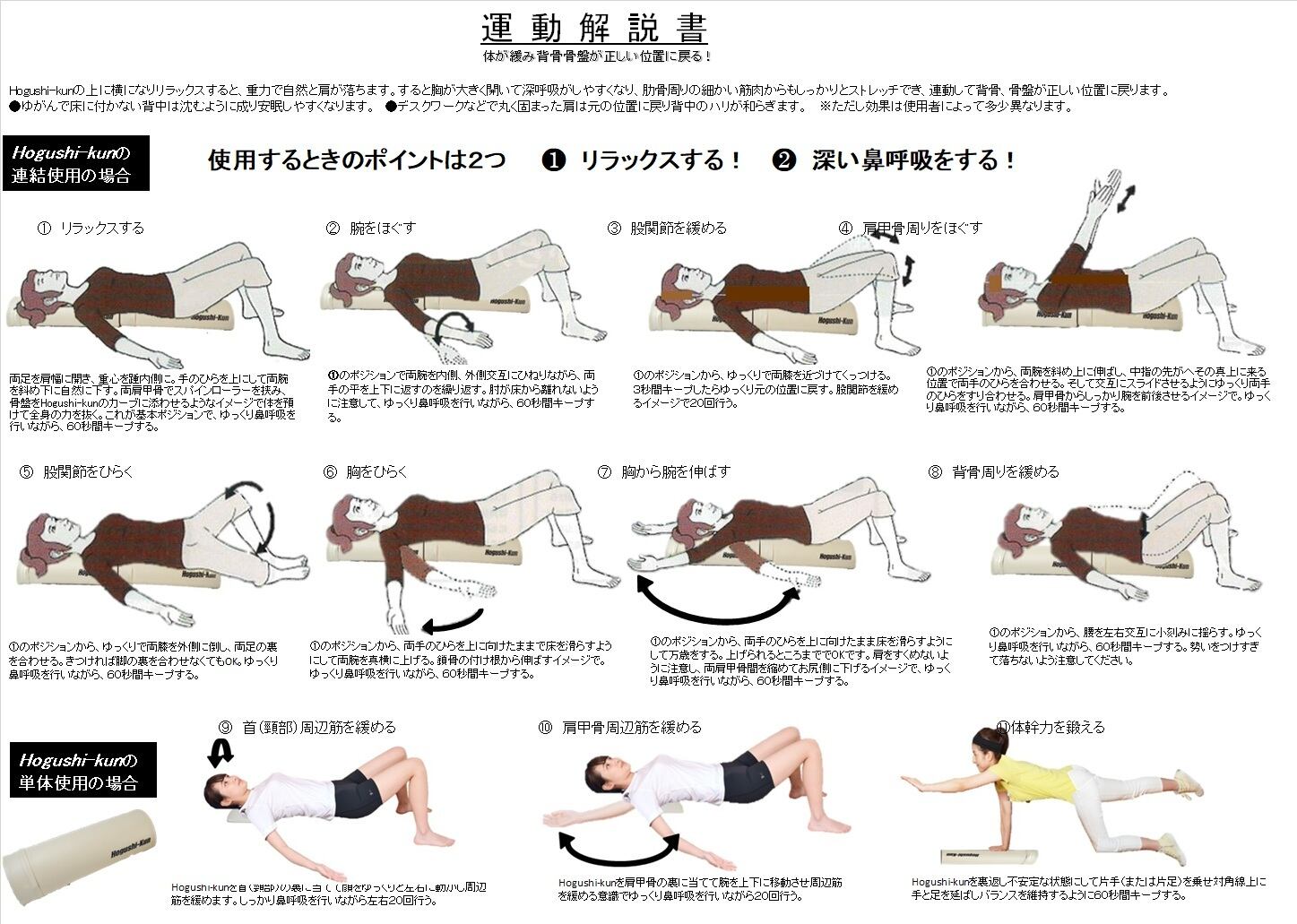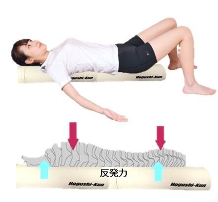 Hogushi-kunに体を預けてリラックスし、深呼吸をすることで、自然と肩が落ちます。すると胸が開いて深呼吸がしやすくなり、肋骨周りの細かい筋肉も伸びるストレッチができ、背骨や骨盤が正しい位置に戻り、歪んで床に付かなかった肩が沈み背中のハリが和らぎます。Hogushi-kun本体は硬度約40度設定で固くなく年配者や女性ににも手軽に使えます。