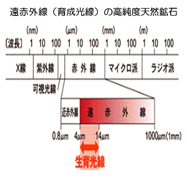 NASA研究では宇宙船内での生物存在条件は「遠赤外線」が生物存在に欠かせないことがわかりました。 人間の健康時平均体温は36,5℃ですがこの温度を波長に換算すると約10μmです。太陽の放射光線で地上に達する「遠赤外線」は3.5μmと10μmを頂点とする2つの波長体で、水の遠赤外線吸収スペクトルは3μmと6~12μmであり、動植物の吸収波長も6~12μmです。つまり生命の源である水と有機物は3~12μmの遠赤外線を吸収しているわけで生命に欠くことのできない生育光線なのです。