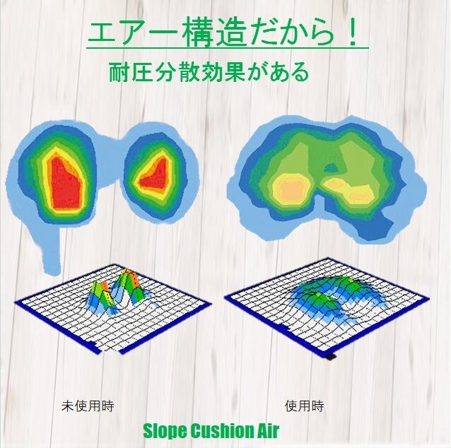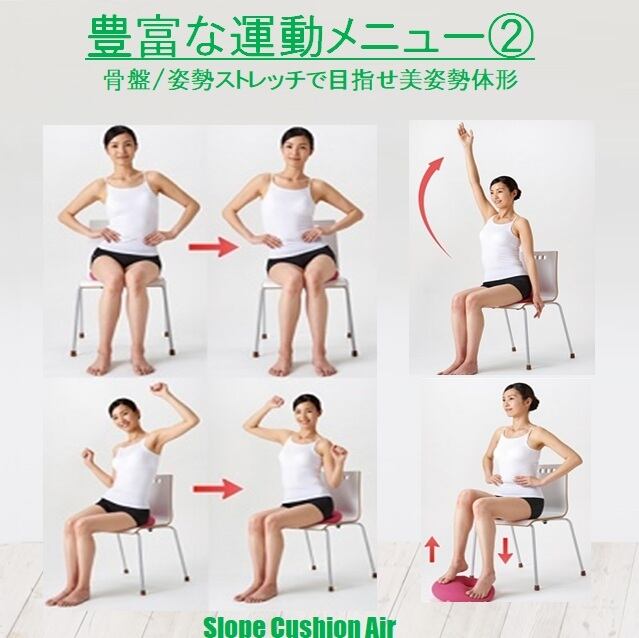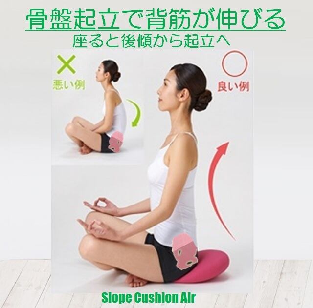「スロークッションエアー」は傾斜構造が骨盤を起立させエアークッションでインナーマッスルを鍛えれて骨盤周辺筋の柔軟性づくりがをエアーを動かす事で可能となります。