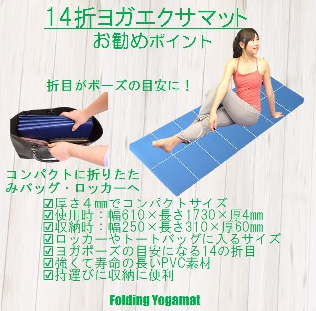「折りたたみヨガマット」は使用サイズ1730×610×4mm 収納サイズ250×310×60mmでコンパクトに折りたため素材はPVCで床密性は高くストレッチ時の体を支えることができ、スタジオの床に置いて使用でき汚れも水洗いで落とせます。